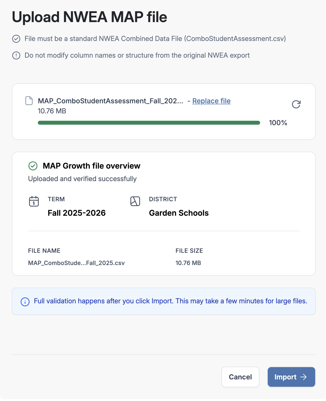 The workflow is straightforward: navigate to the Assessments section then upload your MAP Growth export file. Before processing begins, the system shows you a sanity check summary with your district and term so you can confirm you grabbed the right file. If anything looks off with the file format, you'll see clear error messages right away instead of finding out days later.